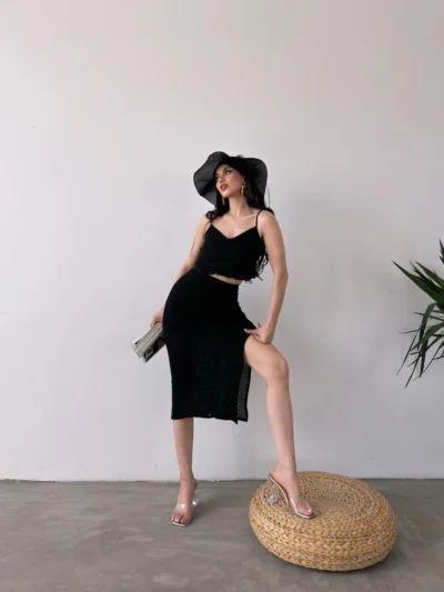 Black Ruffle Detail Knit Crop Top & Skirt Set